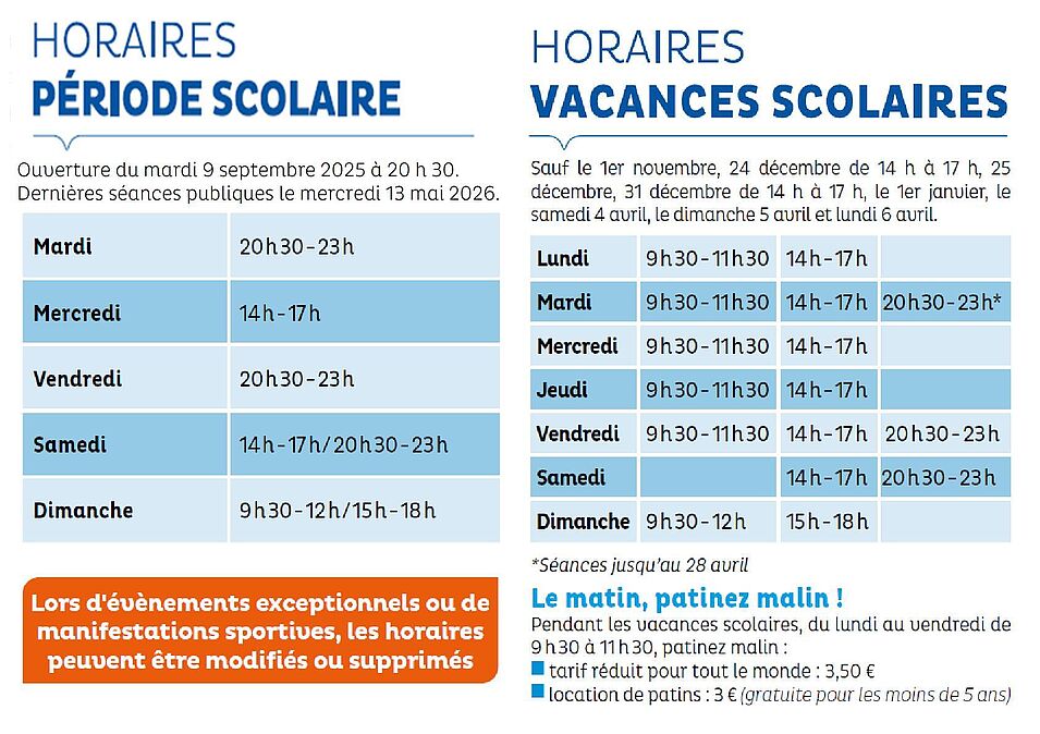 | Location de patins (gratuite pour les moins de 5 ans) | 3 € | 30 € |